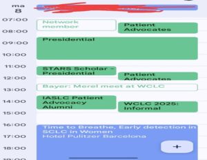 Merel had zich opgegeven voor het STARS Scholar program, waarbij Patient Research Advocated verdieping in het onderzoek als lesstof kregen. STARS staat voor Supportive Training for Advocates on Research and Science. Na afloop van de conferentie was er besloten tot een afsluitend etentje met alle studenten. Daar mocht ik ook bij zijn. Een zeer gemêleerd en uit alle delen van de wereld afkomstige groep mensen die elkaar in de wereld van (long)kanker hebben gevonden. Met allen een eigen verhaal en diversiteit aan rollen. Ik vond het geweldig en bijzonder indrukwekkend! Tegenover mij een joviale kerel uit Australië die zijn vrouw had verloren aan kanker, terwijl hij zelf al jaren geleden een vervelende diagnose had gekregen. Daarnaast een man uit India, waarvan Merel zei; die heeft zoveel bereikt in zijn land qua toegang tot medicatie! Naast mij een jongeman uit New York, die verbonden was als mentor. En zo waren er mensen uit Argentinie, Australie, Nigeria en nog meer Amerikanen. Een ding viel me op; een hele hechte groep die met zoveel humor het leven wilden vieren met elkaar. Bijzonder en intens tegelijk. Het was gelijk ook het einde van een hele week congres voor Merel.