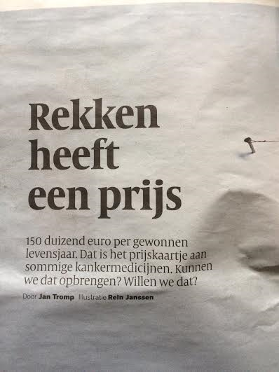 Maar dan lees je in de Volkskrant van zaterdag 2 januari het stuk over dure medicijnen en alleen de kop van het artikel maakte me al razend en ik had even nodig om me te realiseren wat me zo razend maakte. Ik heb getwijfeld of ik er een ingezonden brief van moest maken naar de Volkskrant, maar heb besloten het bij mezelf te houden. Al hoop ik wel reacties, aanvullingen, andere inzichten te krijgen.